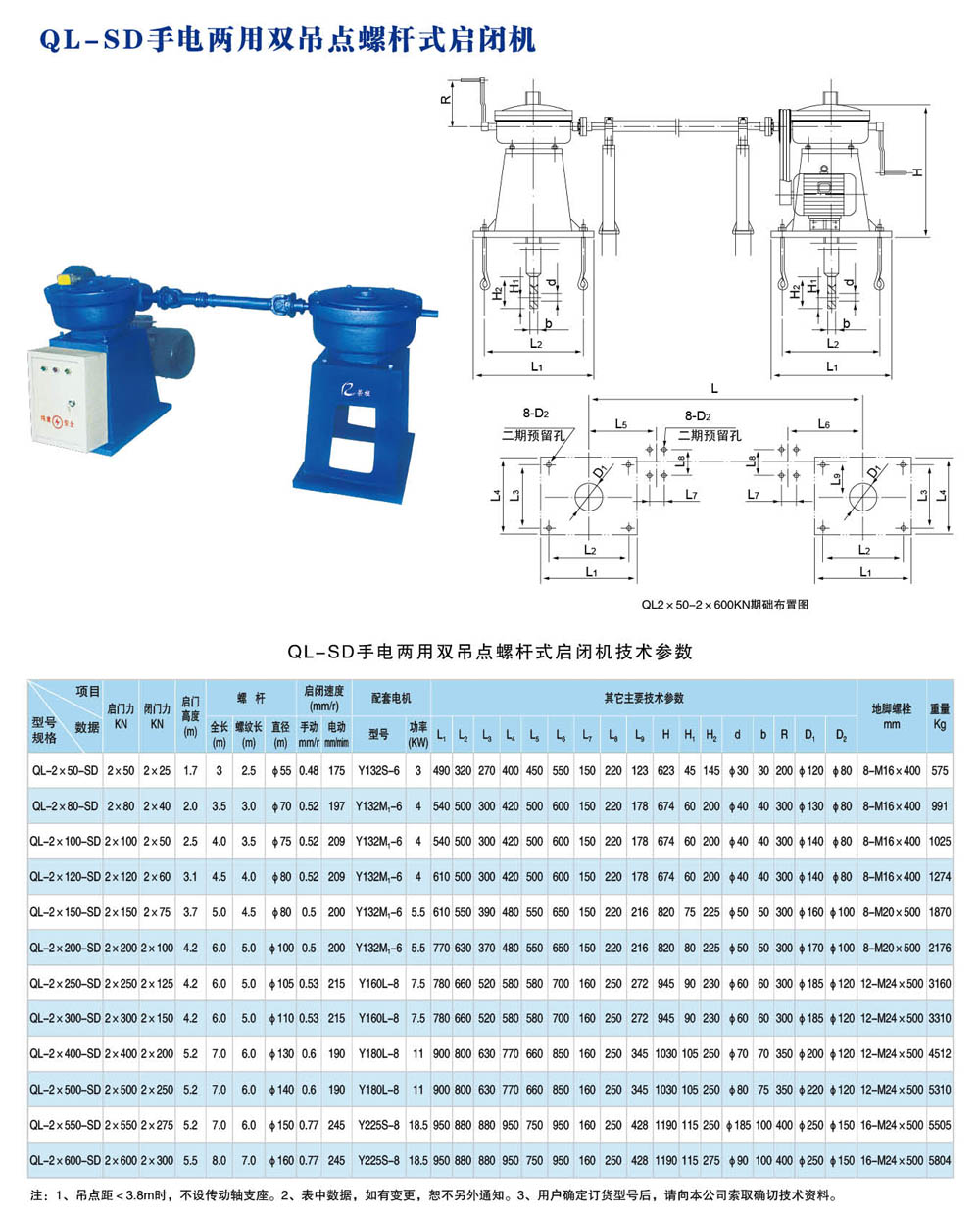 本系列啟閉機按吊點數分為單吊點和雙吊點兩種型號,按驅動方式分為手動、電動和手電兩用三種形式,一般啟閉容量超過600KN(單機)時不再配置手動機構。我公司生產的QL型系列啟閉機啟門為3KN-650KN,超過650KN(單機)時可特殊設計。